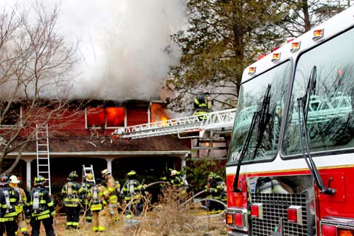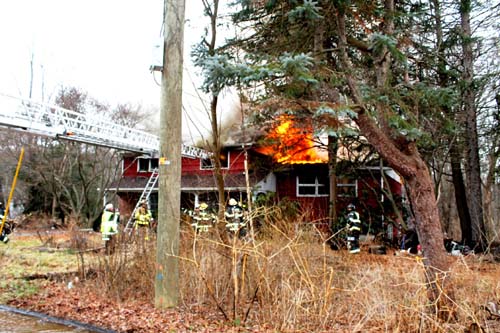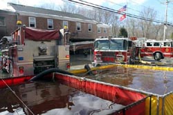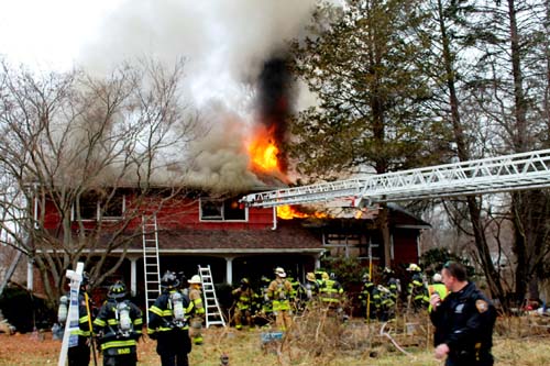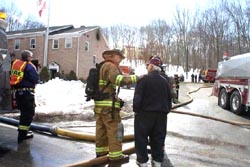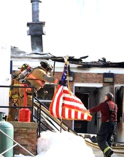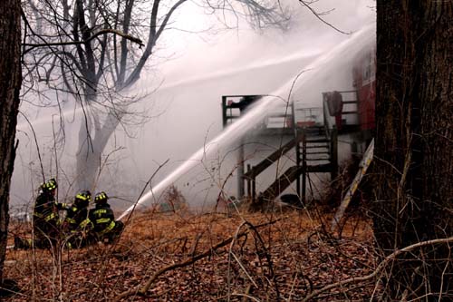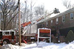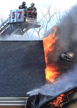![]() Mohegan uses the ladder pipe to douse the fire upstairs |