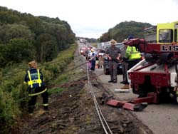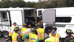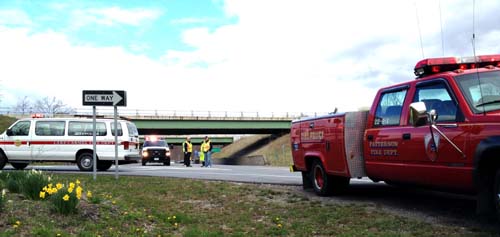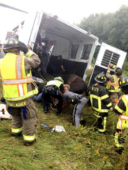 A Durango towing a trailer containing two horses went over a 100' embankment on the east bound lane of Route I 84 just past Exit 18 in Patterson resulting in the New York State Police and Patterson Fire Police closing both lanes while emergency responders worked at the scene. None of the three passengers in the vehicle were injured and one horse exited the trailer under its' own power. The second horse, on its' side, was sedated and remained in the carrier while it was winched to another waiting carrier on the road which transported it to a nearby equine medical facility. It is reported it the injured horse fully recovered. The crash, reported at 9:30 a.m. on a Saturday, tied most up local roads with massive traffic jams of vehicles exiting 84 attempting to re-enter the highway in Southeast.