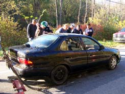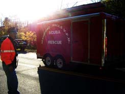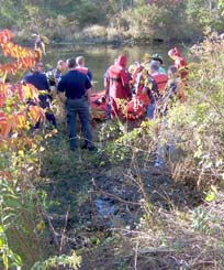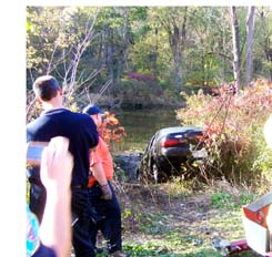The "Team" again visited the Brewster Fire District to assist their fire police at a recovery of a completely submerged car in a river that borders Route 22 south of the Village just over the Westchester County line. The driver, apparently uninjured, swam to shore and..."went home"! 10/15/08 |