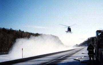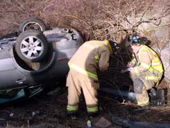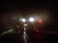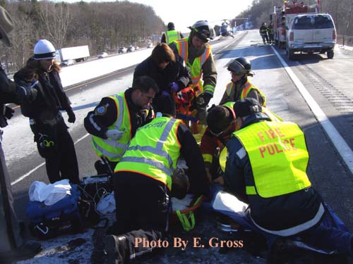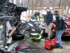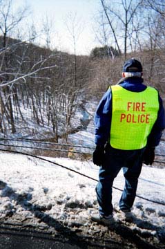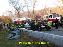 With a wind chill temperature below zero, Lake Carmel & Patterson fire police worked together, under automatic mutual aid, on the east bound lane of Interstate 84. The driver was pinned in his car, that flipped over the guard rail and traveled 75’ down a 45 degree sloped embankment into a small stream. They deployed about 250 yards of cones reserving one lane for operations. 84 was shut down several times during the rescue to allow for responding apparatus, a LifeStar chopper from New Haven to land, and recovery vehicles. The motorist survived the crash. 01/15/09 |