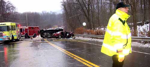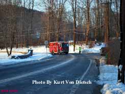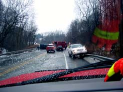 Sunday December 13th dawned with clear dry roads and an air temperature of 17 degrees. Just before noon, falling rain froze on contact with the pavement instantly rendering roads in Putnam County and neighboring counties all but impassable. In three hours, from 11:30 am to 2:30 pm, Putnam 911 received over 629 calls (a total of 857 calls from 11 am to 4 pm…the most to date) for assistance and recorded 175 crashes (there was probably triple that number of fender-benders that did not require assistance and drove off). The most serious crash in Patterson was, between a 2004 Ford pickup that lost control and collided head-on with a 2001 Buick sedan on a hill on Route 22 just north of Route 164. Each vehicle had three occupants. An unbelted woman riding in the in the rear seat of the Buick received injuries that proved fatal while the driver, entrapped, was cut free and rescued by the Patterson FD. All the other injuries were minor or non life threatening. Putnam Lake FD assisted at the scene as did multiple ambulance squads & medics, both at the initial crash, and a secondary PIAA 100’ or so to the south. Several other crashes on the hill did not require medical assistance. Walking on the ice was almost impossible without the use of several bags of speedy-dry for traction. The NYSDOT sanders did not arrive for hours, and only after the call was terminated. One Patterson Highway sander did manage to reach the scene and assist just as the PC Sheriff’s Office was concluding their investigation. Every emergency agency with their fire police in the county responded to multiple calls and virtually every road was blocked for hours, by disabled vehicles. 12/13/09 |