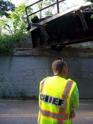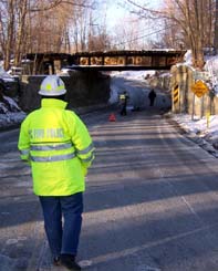 A truck hit and left the RR bridge at Rt. 164 & Bullet Hole Rd, in Patterson, NY, hanging off it's concrete supports. Only a fiber-optic cable passing over the road held the span from completely collapsing. The Patterson FD Fire Police Company and the Putnam County Fire Police Response Team were dispatched to assist Metro-North with a road closure. Eventually the NYS DOT responded and put up semi-permanent "Road Closed" signs and the fire police were placed back in service.