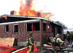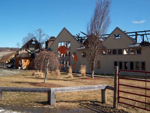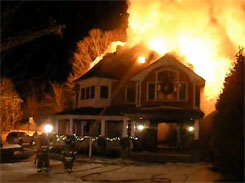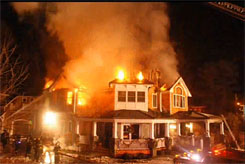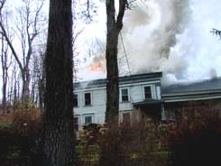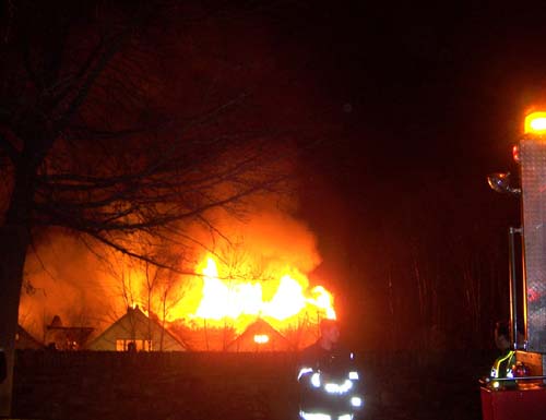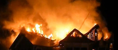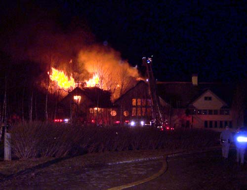 Neighboring Pawling & Patterson fire police worked most of the night to close roads and regulate a tanker shuttle, alternately filling three portable pools, at a structure fire at 660 Old Quaker Hill in the Pawling. The 10,000 sq. ft. multi-million dollar mansion, built in a Colonial South African architectural style (replete with thatched roofs) was set back from the roadway and surrounded by a stone wall with only two access driveways for apparatus. No less than a dozen departments from Dutchess, Putnam Counties along with neighboring Connecticut, worked to bring the blaze under control. The cause remains under investigation. 03/07/09 |