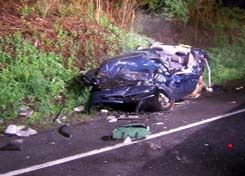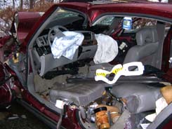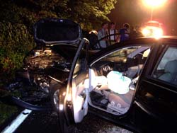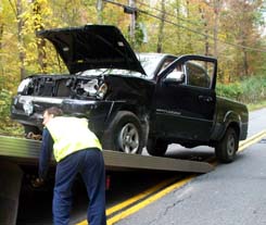 A unlicensed driver, claiming he dropped his cell phone, subsequently collided with a landscape company trailer towed by a truck of workers. It was necessary for Mahopac FD to extricate him. They in turn requested the Putnam Fire Police close Route 6 at Baldwin Place & Route 118 during the morning rush hour while Carmel PD completed their investigation. The Mohegan Lake Fire Police also assisted until relieved by the team. Only the driver of the auto, who was StatFlighted from the scene, was injured. 06/24/09 |