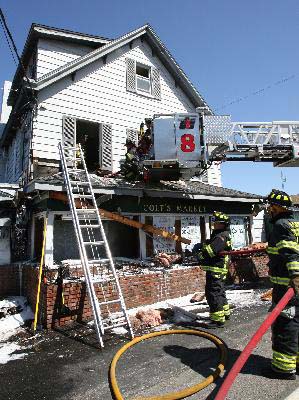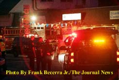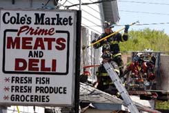 Fire police from Cortland Engine Co. had plenty help with traffic and crowd control from neighboring PNWFPA member departments including some from Verplanck, Montrose Veterans Administration Hospital, Croton and Peekskill Fire Departments. The 1:30 p.m. fire was in Cole’s Market, a local landmark, on the corner since the 1890s, and located right next door to the Montrose firehouse. Many FPOs were on duty along Albany Post Road for over four hours. The cause is under investigation. All photos by Joe Larese/Journal News 04/14/10 |