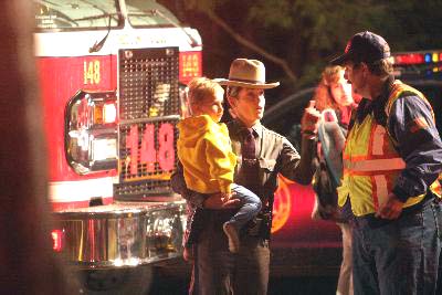 A NYS State Trooper holding a young boy chats with Somers Fire Police officer Daniel Moran at the scene of a 2:14 AM attic fire at a residence on Route 118.