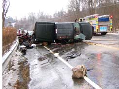 A collision occurred on the I 84 off ramp onto I 684 southbound, where an ambulance was involved in a hit and run crash, overturned and resulted in injuries to the medics. The driver of the ambulance had to be extricated from the damaged vehicle. Fortunately, no patient was being transported by the ambulance at the time of the crash. Both crew members were transported by the Brewster Fire Department who had responded with fire, rescue, ambulance and fire police personnel. The other vehicle involved left the scene. 02/20/10 |