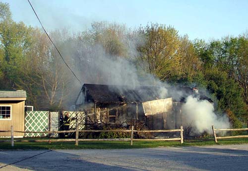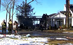 Pawling was called to a fire in an attached garage containing two cars located at 44 Game Farm Road, (a very narrow lane in the Quaker Hill section of town). Tankers from Dover, Patterson and Sherman, CT. supplied water until a water source at an ice covered pond could be established. Pawling’s fire police truck responded north of the scene; Patterson’s fire police truck set up on the south along with Dover & Pawling fire police to effectively close the road. The fire was stopped at the breezeway before it could damage the main part of the house 02/12/10 |
