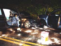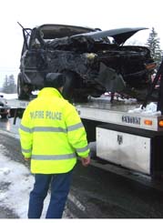 Brewster Fire Police responded with their van, 11-8-2, and maintained security at the intersection of Routes 6 & 22, the scene of horrific crash. A drunk illegal alien driving a Ford F-350 pickup truck, killed a mother and her young daughter walking to a dance studio where the child was a student, pinning the 2nd grader against the building and the mother under the vehicle. 06/09/09 |