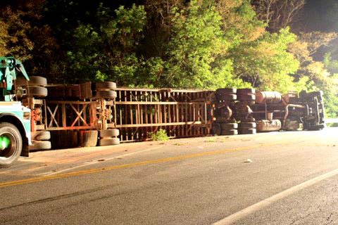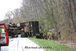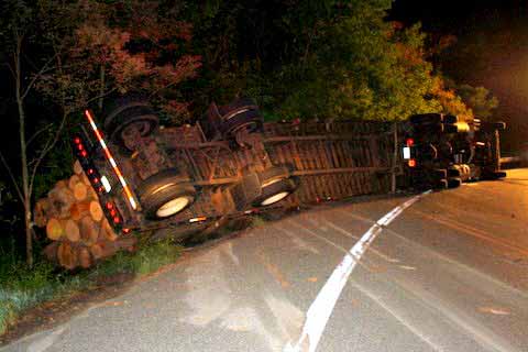 A top-heavy tractor trailer, loaded with logs, wound up lying on its’ side on the Rt. 55 exit ramp in Pawling. There were no serious injuries. PFD Firefighters, EMS, Fire Police and State Police were at the scene from 10:30 p.m. until 2:00 a.m. until back-up trucks arrived to transfer the logs.