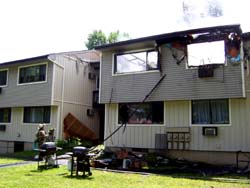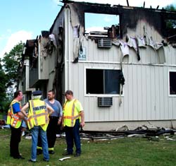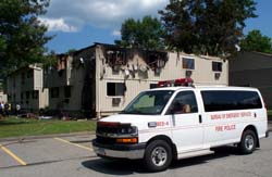 A mid-morning fire at Patterson Village condos in the heart of the Hamlet evolved to include over 25 fire department and emergency agencies (including those moving up, standby, ambulance, etc.) from Putnam, Dutchess and Fairfield (CT) Counties. Lacking hydrants, tankers a were the only water source available at the scene. All members of the Patterson fire police company turned out and were assisted by members of the Putnam County Fire Police Response Team. They assisted with evacuations, crowd control and were detailed to control traffic at two major road locations. The first at the main water source, known as the Fireman’s Ice Pond, located off Route 311, the towns the main east-west thoroughfare. No less than nine tankers shuttled water from the pond located ¾ of a mile to the condos, which are also located off 311 (the second fire police control post at the intersection of Route 292). Fire police control of the roads insured a rapid turnaround of tankers. At no time were the firefighters lacking for water and emergency road access to and from the scene remained open. The cause is unknown at this time. Although fire was through to roof upon arrival, ample man-power and team work confined major damage to only four units-two destroyed-two damaged in one building. Two minor injuries were reported.