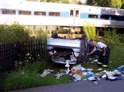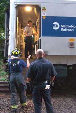 A car that stopped too close to an un-gated railroad crossing in the Hamlet of Patterson on Marble Quarry Road hit by a northbound Metro-North commuter train, rolled over several times before coming to rest upside down west of the single track line. Since the engine was almost to the Patterson train platform and crossing, the RR gates on Route 311 remained in the “down” position. Unfortunately, Patterson’s Fire Station 1, is located on the east side of the rail line. The first fire police arrived early enough to assume control of the crossing and cross streets and immediately cleared the traffic jam. This created a path for responders to drive between the downed gates to reach the firehouse and subsequently return with the needed fire apparatus and ambulance. Firefighters lifted the Honda Civic searching for a reported missing second occupant… a report which was later to be proved false. The male driver was transported to the hospital by Patterson FD ambulance with non-life threatening injuries. Fire police assisted MTA Police with crowd control and after sun set, helped their department members with the transfer of passengers as they walked along the tracks to a waiting rescue train.