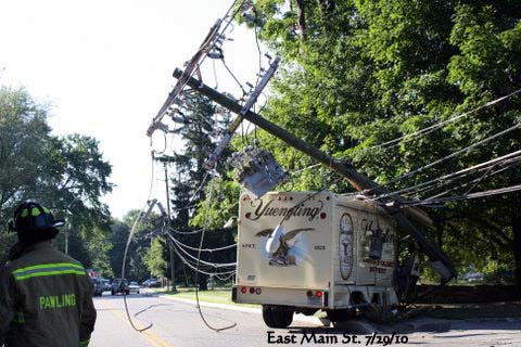 At about 9:00 a.m., a beer truck ran into the pole on East Main St. in Pawling shutting down electric service for about three hours, including the traffic lights on Route 22. A NYSEG employee's on the scene said they could not do anything until, "all fluids were drained from the truck"…in spite of the early hour, many fire personnel volunteered to assist but alas, none were chosen!