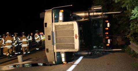 05:05 AM Putnam Valley FD to respond to the TSP southbound, for a jackknifed tractor trailer & a fuel spill blocking 2 southbound lanes with part of the rig over the guardrail into the northbound lane. The driver had hit the Route 301 overpass & he was told by his company to remain there until DOT arrived. He left the scene southbound (heading for Queens NY) with a weakened trailer. On a turn the trailer broke near its’ center causing it to jackknife. Charges included those related to the accident, a felony, for not having a logbook.