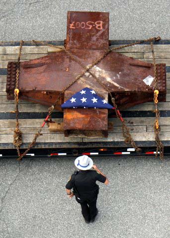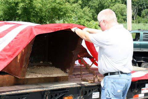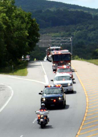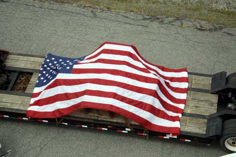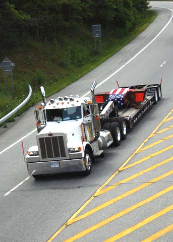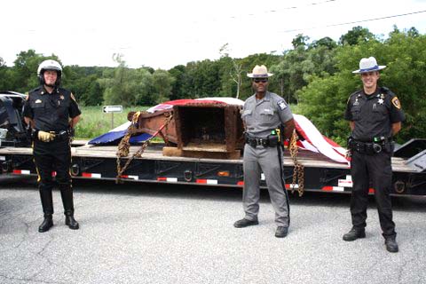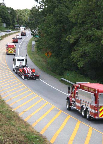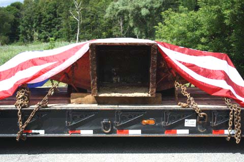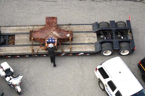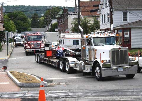 A six and one half ton piece of steel from the North Tower of the WTC 911 arrived in Pawling on July 27, 2011 around 10:30 AM. An escorted flatbed (donated by Pawling business man Steve Parrino who owns Parrino Garden Center) transported the soon to be memorial monument, from JFK Airport to Pawling. PFD Chief Dave Denzel, Asst. Chief Everett White, Commissioner's Ron Gallagher & Jim McCarthy participated in escorting the mass to the Putnam/Dutchess Counties' line where they were joined by Pawling Mayor Robert Liffland, Town Supervisor Dave Kelly, along with fire apparatus, to complete the trip to its' final destination at Pawling Station 1. The escort also included participation by members of the Dutchess County Sheriff's Office and NYS Trooper's. The department plans a Memorial Service on the Sept. 11, 2011 which will be open to the public.