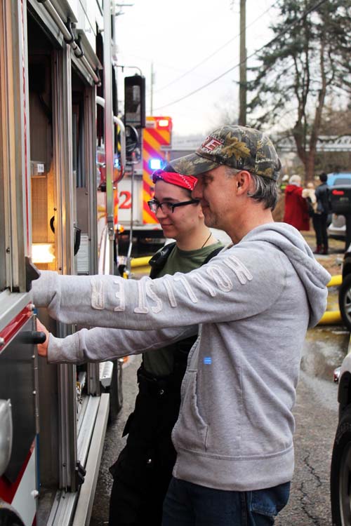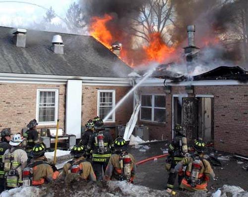 ![]() Mohegan uses the ladder pipe to douse the fire upstairs |
