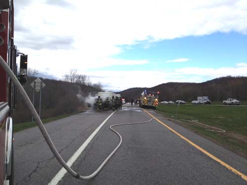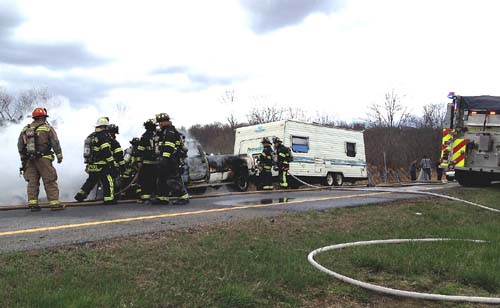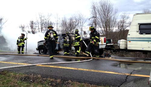 Patterson, Lake Carmel, and Putnam Lake Fire Departments were called to a truck fire on the east bound exit ramp from I 84 to Route 311. Upon arrival the pickup, towing a vacation trailer, was fully involved. Fire police from Patterson and Lake Carmel closed the ramp and expedited an unexpected hasty departure across 311 by two engines from the scene, when they were called under mutual aid to assist at a house trailer fire in a neighboring town.