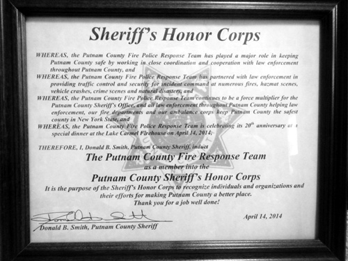 The April Christmas Party tradition continued when the members of the Putnam County Fire Police Response Team combined their Annual April meeting with a festive party at Arturo’s in Mahopac. Highlights of the evening included several committee faux chairmen certificates given for “Marriage Counseling” and “Lemon Yellow Regulator”, among others, and recognition of ten year member Pat McQuillan by Commissioner of Emergency Services Adam Stiebeling.