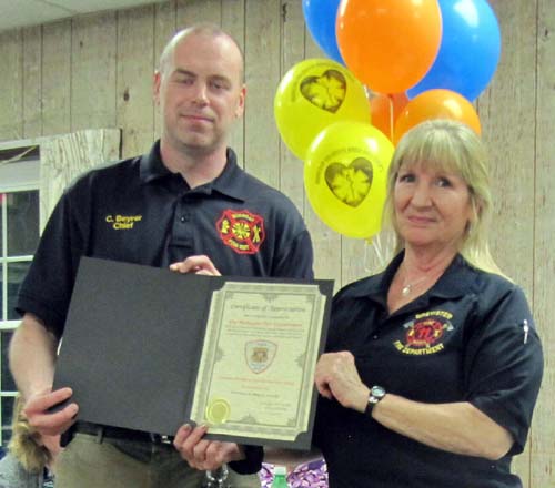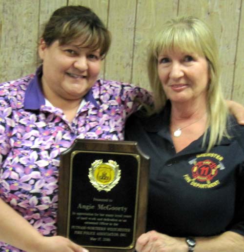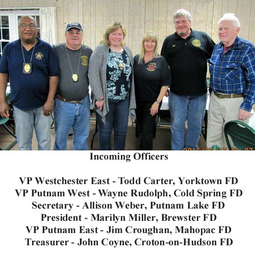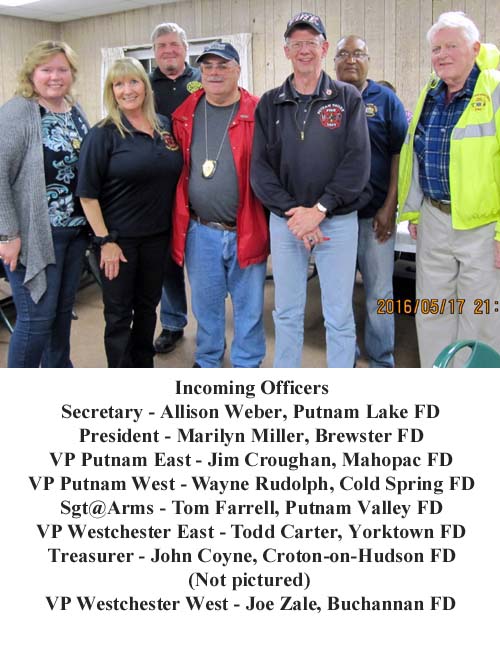 The May meeting was opened by Acting President Marilyn Miller. Chief Chris Beyrer, Mohegan FD, who was on hand to welcome the membership, received a thank you certificate from the Association acknowledging his department's hospitality. During the meeting the annual elections were held. The following officers were elected: