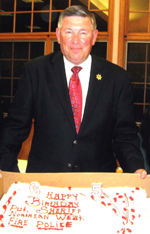 Prior to the meeting, guest of honor Sheriff Donald B. Smith, was surprised when he was treated to a cake and a rousing chorus of Happy Birthday. |