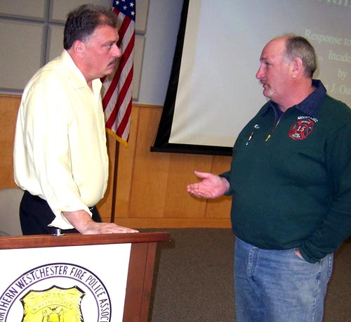 Suffolk County Fire Academy Instructor Paul Gerrard gave a presentation on scene, preservation, responder safety, and observation. He was accompanied by his father, Gene, who is editor of the Volunteer Fire Police News. | |