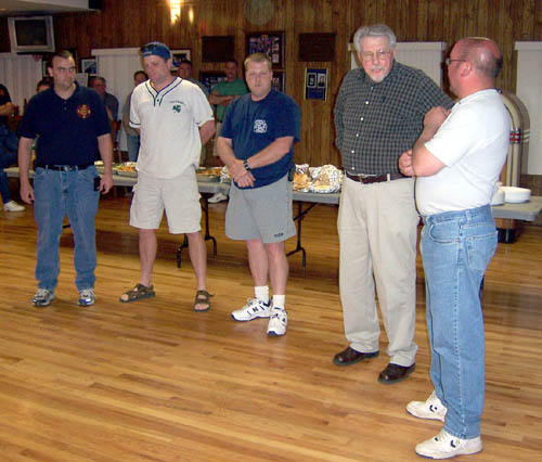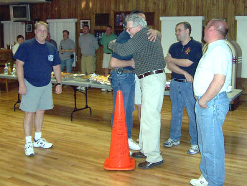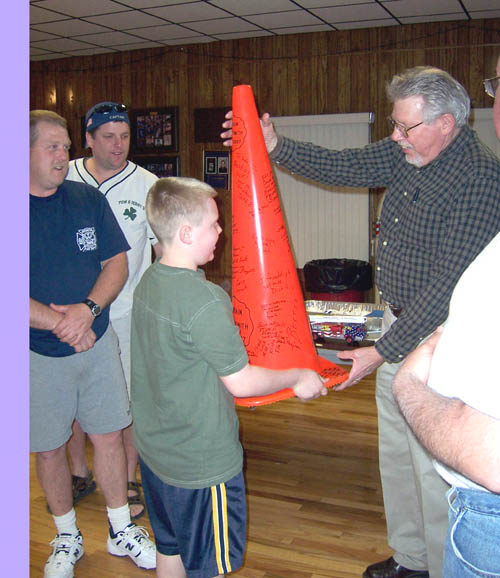 Wayne was presented with his own fire truck and a cone, signed by all present |